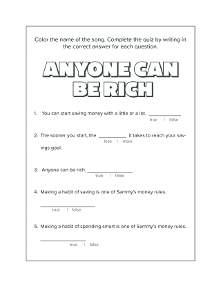 Color the ChorusHave kids color the chorus to the song "Anyone Can Be Rich!" It's a fun activity and challenge to get kids familiar with key concepts and vocabulary in the song. Use the activity to keep kids engaged and teaching them to immediately get in the habit of saving money. Play the song while kids do activity.Premium membership required.Go Premium -