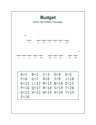 Decode the Secret MessageHave kids decode and solve the hidden message for the song "Budget!" It's a fun activity and challenge to teach kids a key concept in the song. Use the activity to keep kids engaged and and teaching them to budget their money. Play the song while kids do activity.Premium membership required.Go Premium -