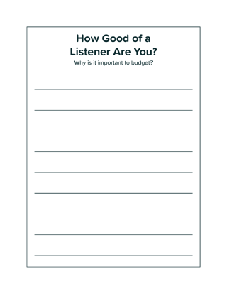 How Good of a Listener Are You?Have kids write about why it is important to budget their money. This is a good activity to discover what kids have learned from the song "Budget!" Use the activity to keep kids engaged and teaching them to budget their money. Play the song while kids do activity.Free membership required.Join for Free -
